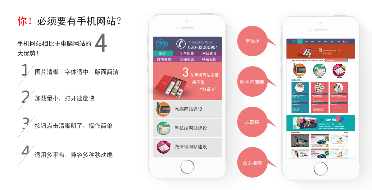 手機網站時代迅猛來襲,你OUT了?截至2014年底,手機網民數達:6.3億網站流量有33%來自移動互聯網并持續上升中56%的移動互聯網網民每天上網1小時以上78%每天至少手機上網1次以上4G時代已經來臨,智能大屏手機的發展,手機網站應運而生,發展迅猛。如果你現在還沒有手機網站,你已經遠遠落后于競爭對手了